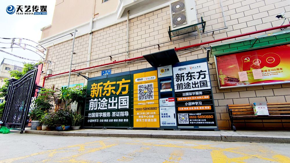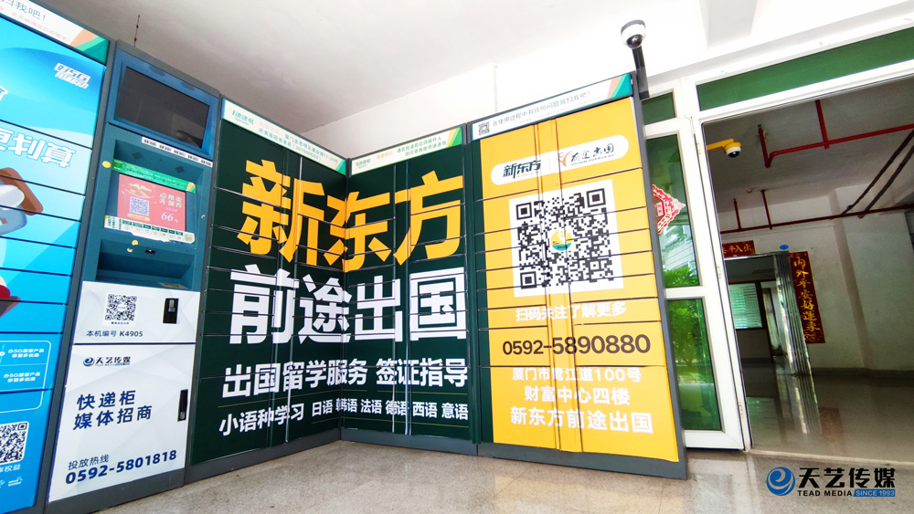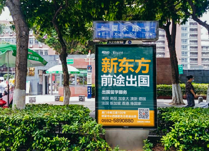 廈門新東方前途出國服務機構(gòu)位于鷺江道財務中心四樓,與廈門天藝傳媒合作,目前在主干道路名牌與生活小區(qū)的快遞柜媒體進行部分宣傳合作。