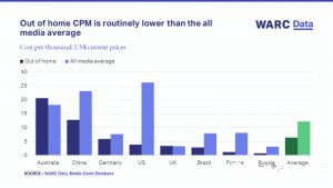 來自WARC媒體成本數(shù)據(jù)庫的數(shù)據(jù)顯示,除了澳洲和英國(guó),戶外在全球主要市場(chǎng)的千人成本一般比所有媒體的平均千人成本都要低。